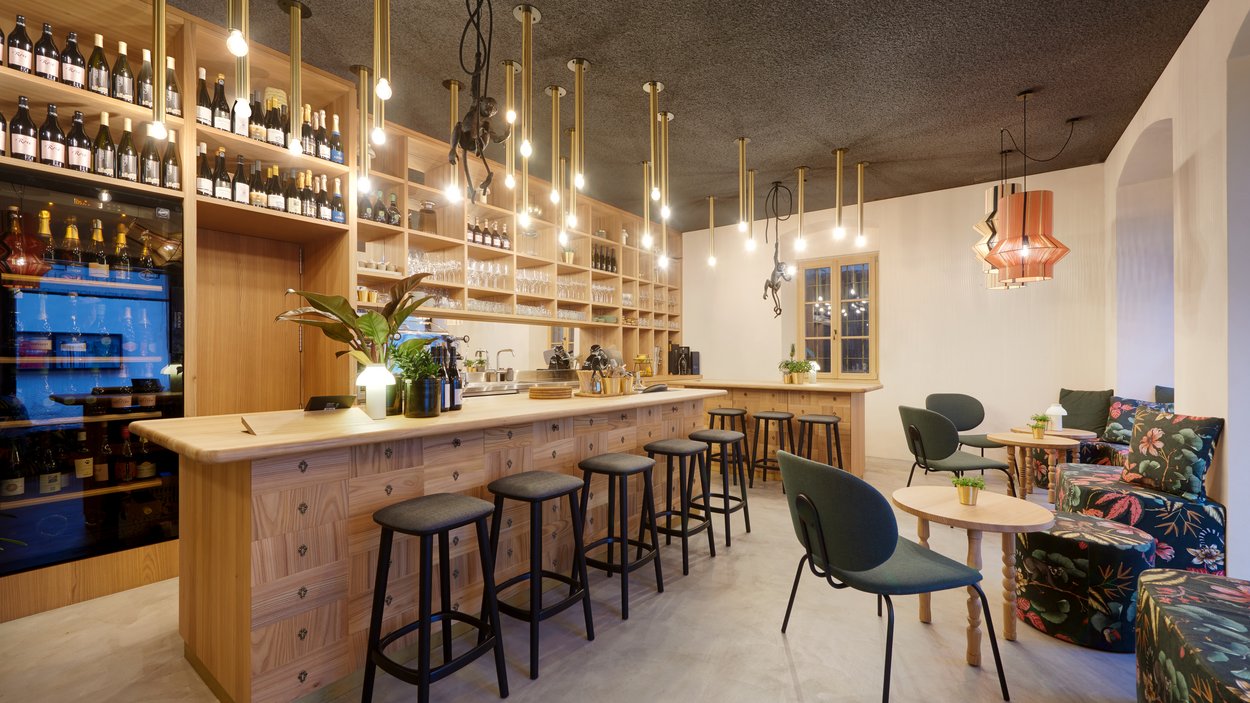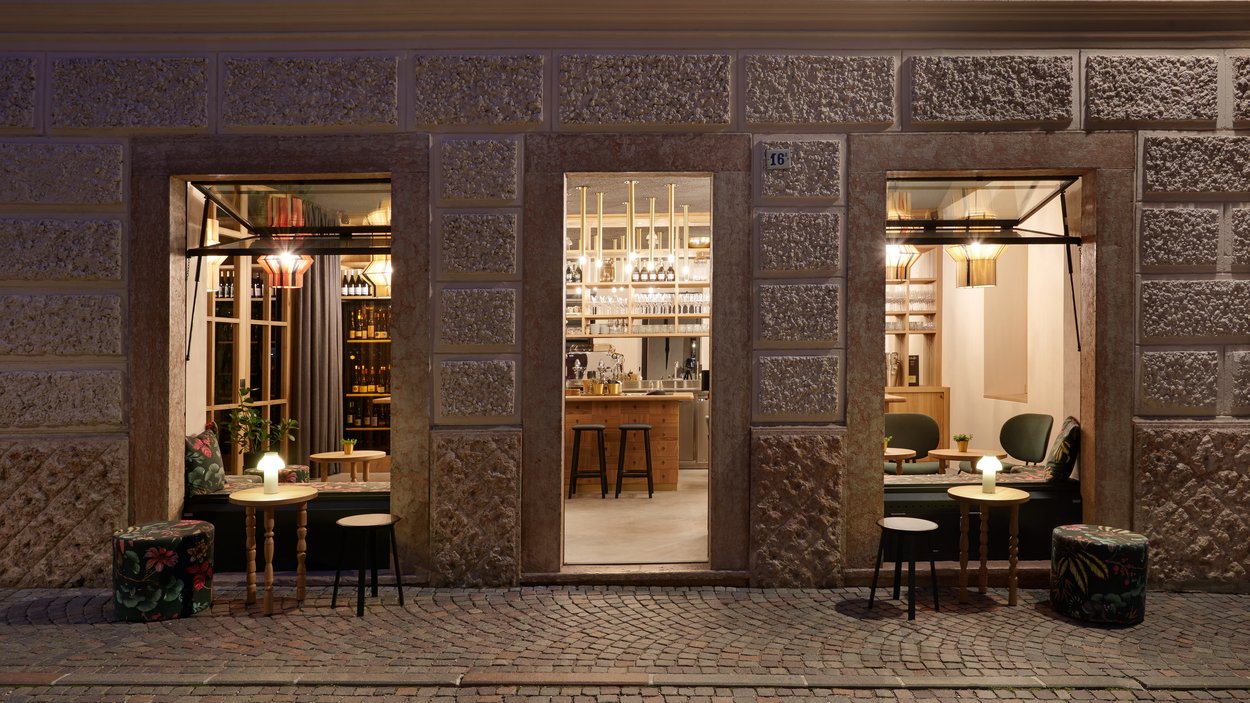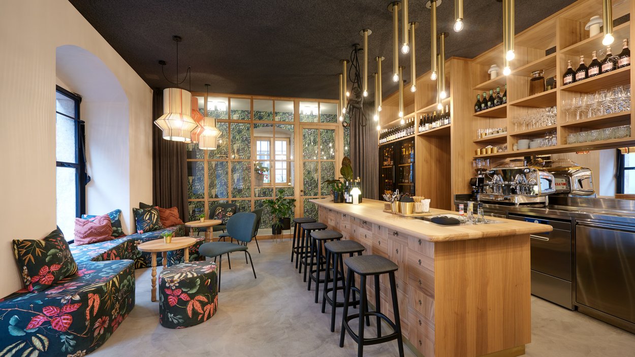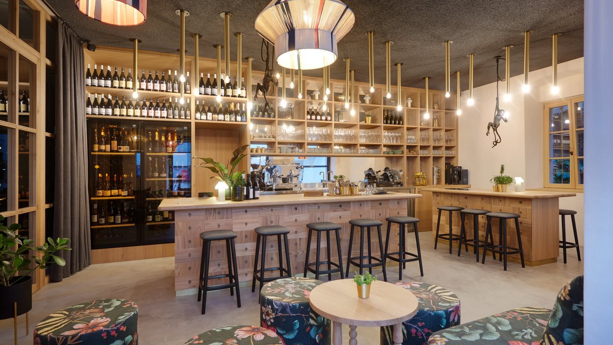 The Bar Perlage is located on the ground floor of the renovated Goldengel building. In terms of the color concept, it forms a unity with the holiday flats on the upper floors. Before the renovation, there was an old shop on the ground floor. The old counters were inspiration for the new bar counters. As in the old days, there is a high shelf on the back wall that serves as a wine display. The two counters were arranged in such a way that personal contact with the guests can be established and people can communicate.
