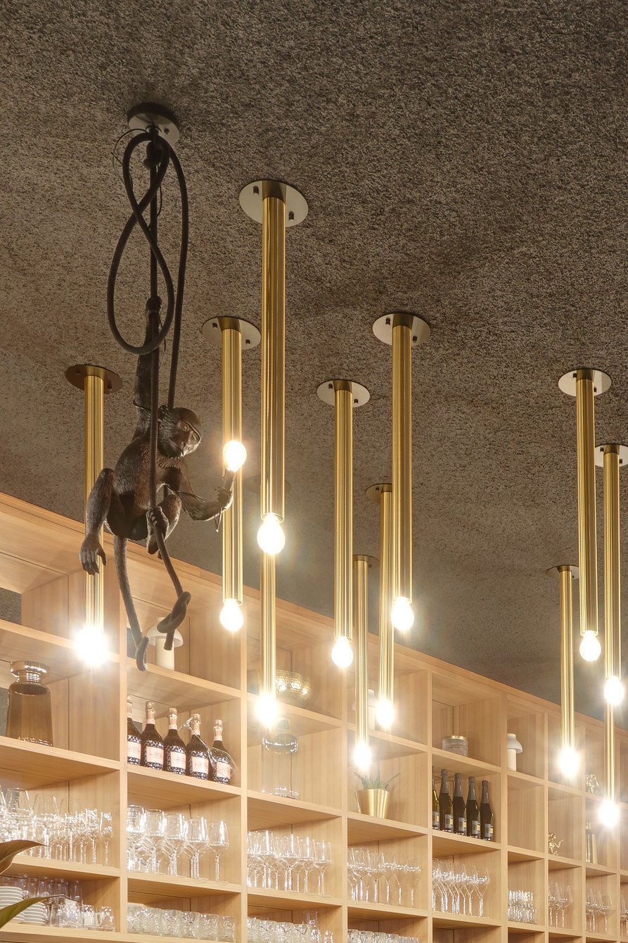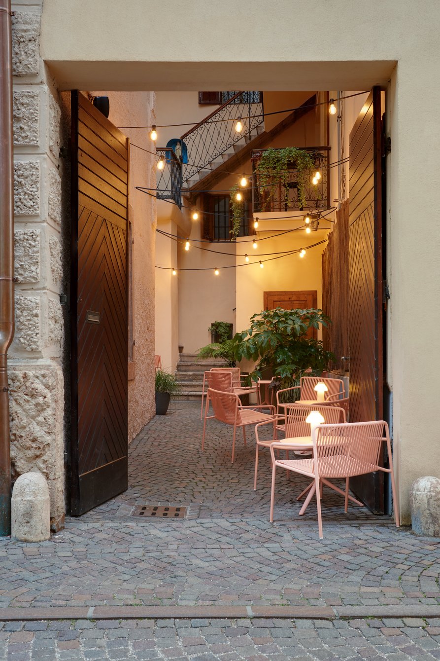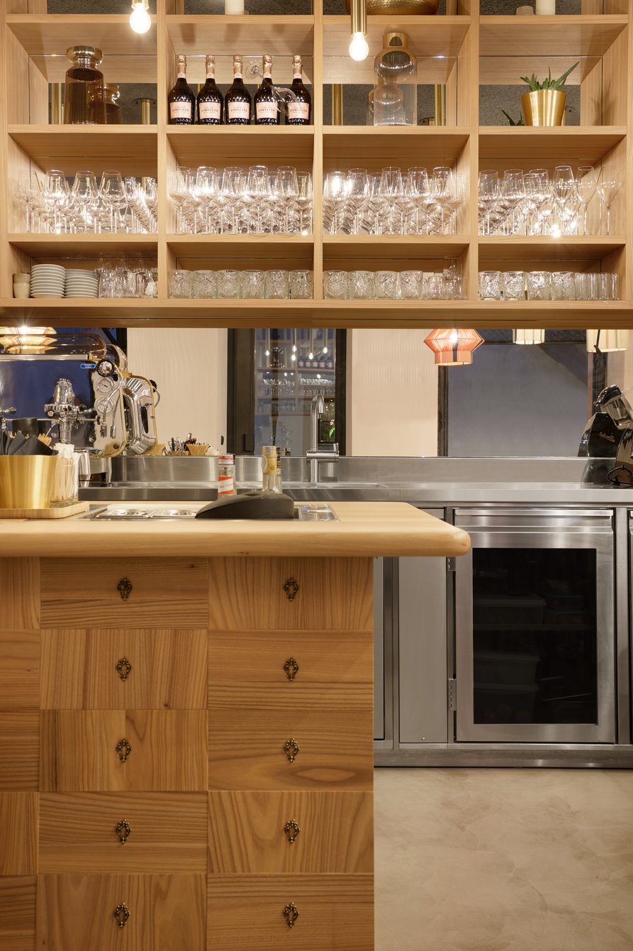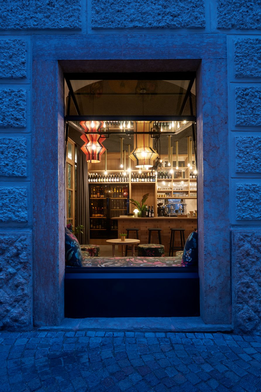 The Bar Perlage is located on the ground floor of the renovated Goldengel building. In terms of the color concept, it forms a unity with the holiday flats on the upper floors. Before the renovation, there was an old shop on the ground floor. The old counters were inspiration for the new bar counters. As in the old days, there is a high shelf on the back wall that serves as a wine display. The two counters were arranged in such a way that personal contact with the guests can be established and people can communicate.