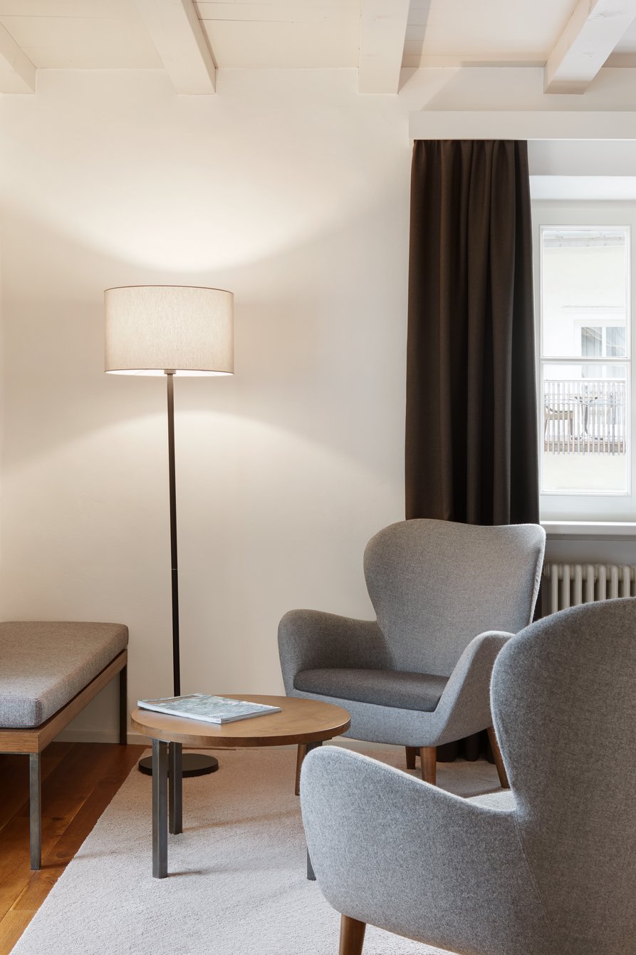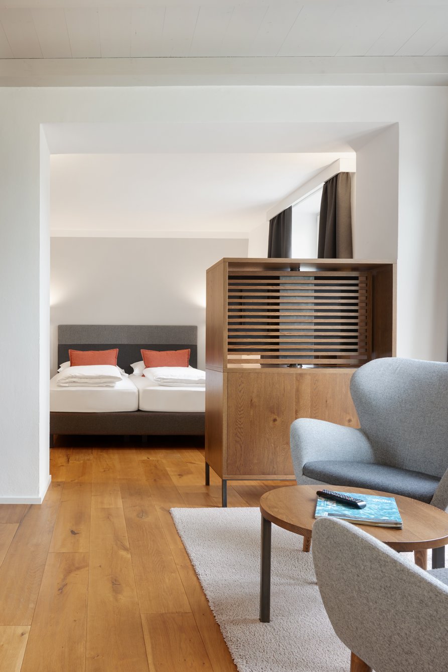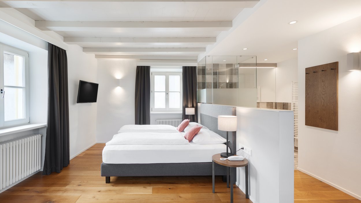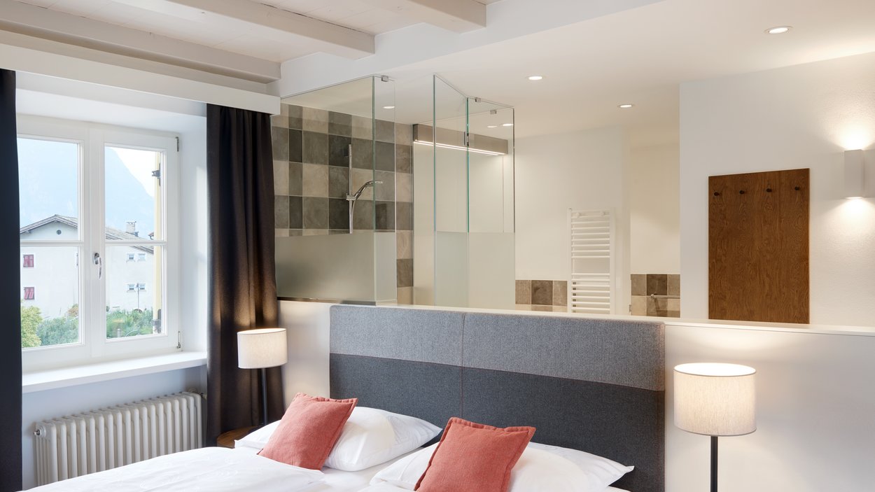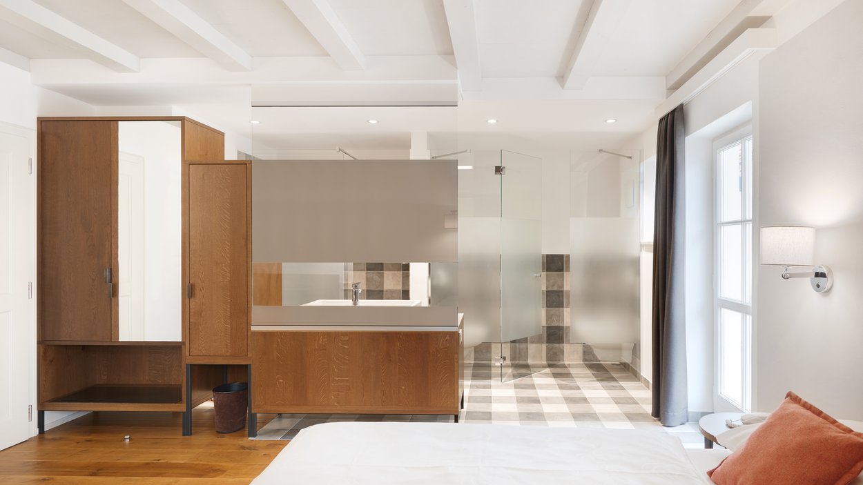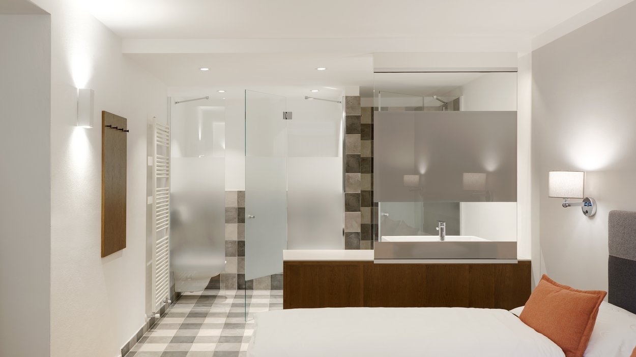Das Nebengebäude des Hotel Teutschhaus wurde intern neu gestaltet. Die kleinen Bäder wurden geöffnet, so entstanden optisch größere Räume. Zusätzlich wurden die Bäder mit Fliesen ausgelegt, die durch das besondere Verlegemuster ein optisches Highlight darstellen und das Bad in den Raum einfließen lassen.