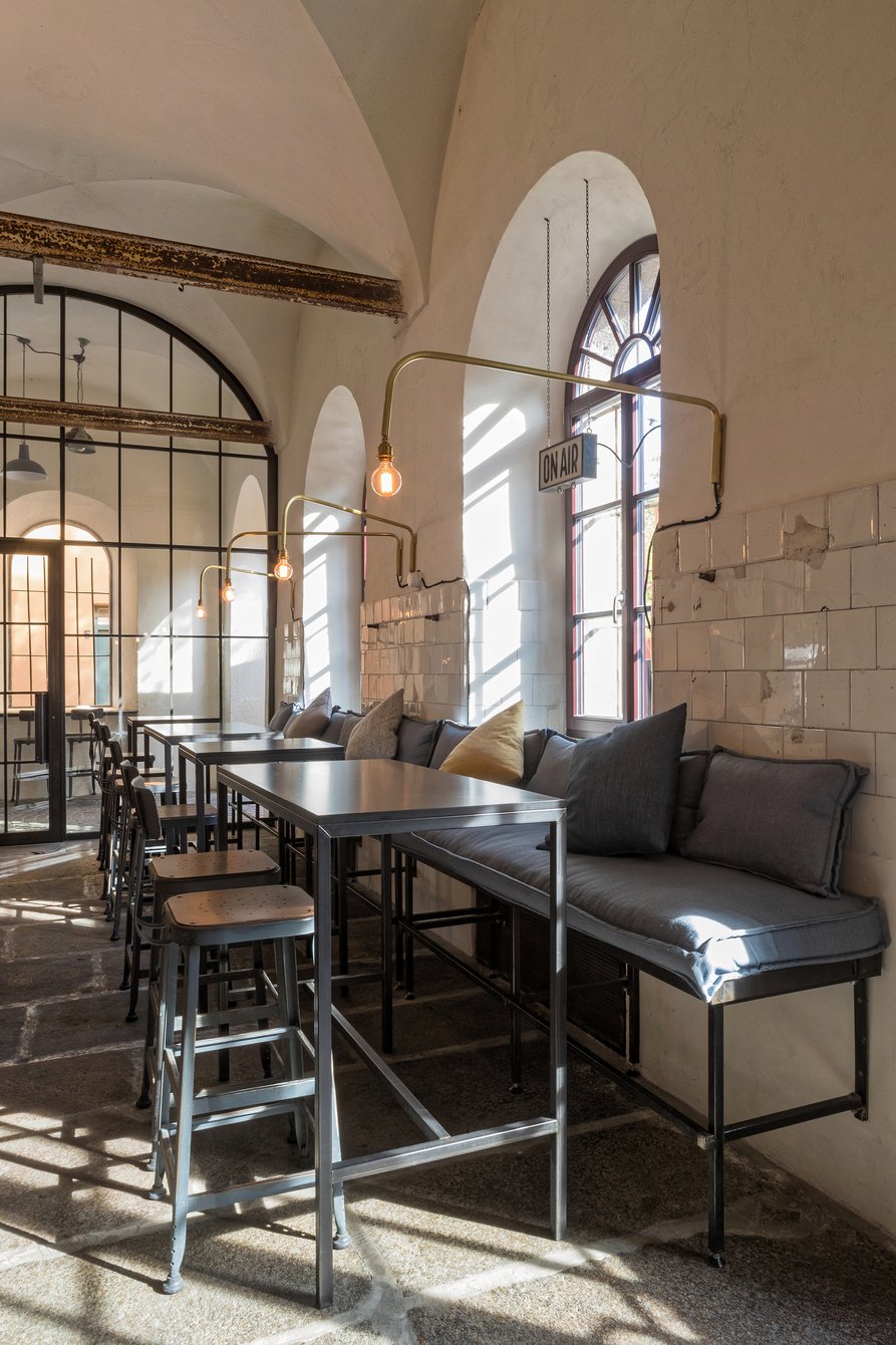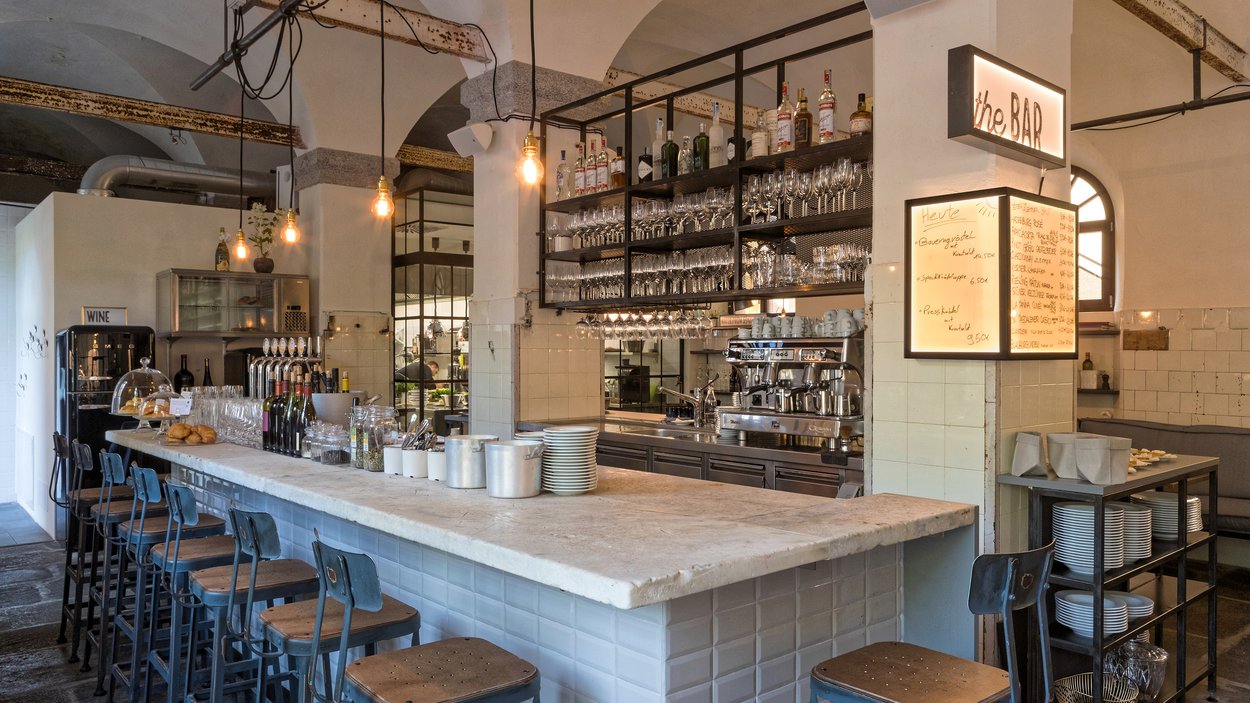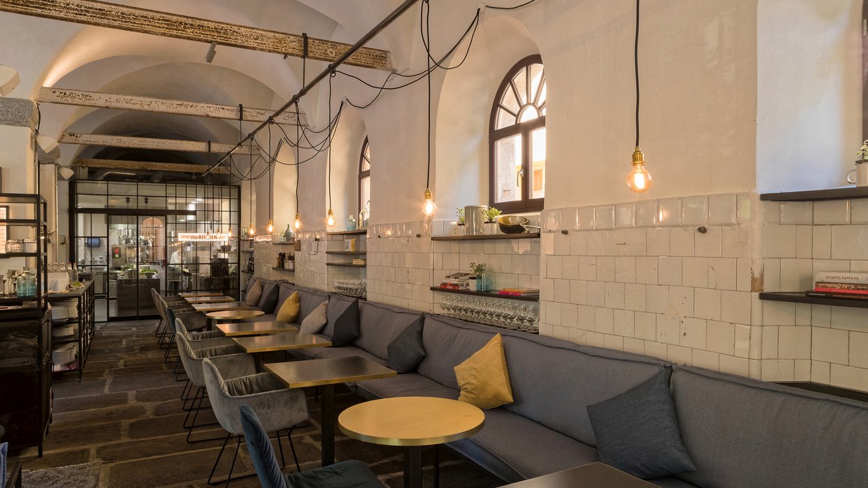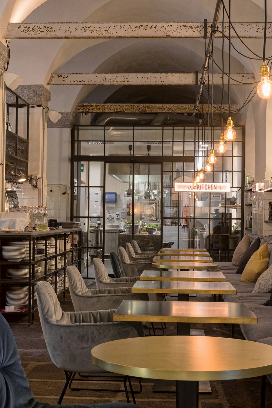 Das Gastronomiekonzept war ein Wohnzimmer für die Stadt zu schaffen und den dafür verschiedenen Ansprüchen gerecht zu werden. So gibt es Möglichkeiten zum Kaffeetrinken am Morgen alleine oder in der Gruppe, Mittagstische die flexibel zusammenstellbar sind, Sitzgruppen für einen Aperitivo und Tische für ein Abendessen. Erreicht wurde diese Flexibilität durch unterschiedliche Sitzmöglichkeiten und diverse Sitzhöhen. Hohe Tische mit Hockern auf der einen Seite, niedrige Esstische auf der anderen Seite getrennt durch Sitzgruppen mit Couches in der Mitte. Die Möbel sind aus Eisen gefertigt um dem Charakter des Raumes gerecht zu werden. Um trotzdem eine Gemütlichkeit zu erzeugen wurden diese mit weichen Polstern kombiniert die in einfarbigen Blautönen in Kombination mit Goldakzenten dem Raum die nötige Wertigkeit als Wohnzimmer geben. Die Küche wurde verglast um dem Gast ein anderen Bezug zur Essenszubereitung zu ermöglichen.
