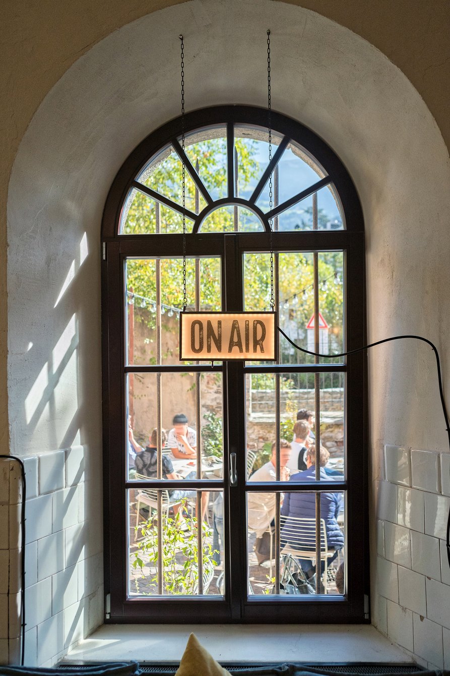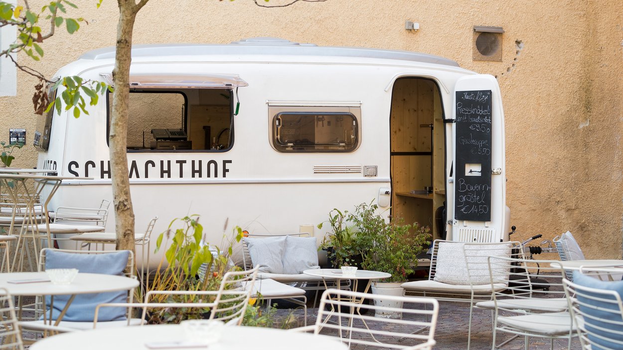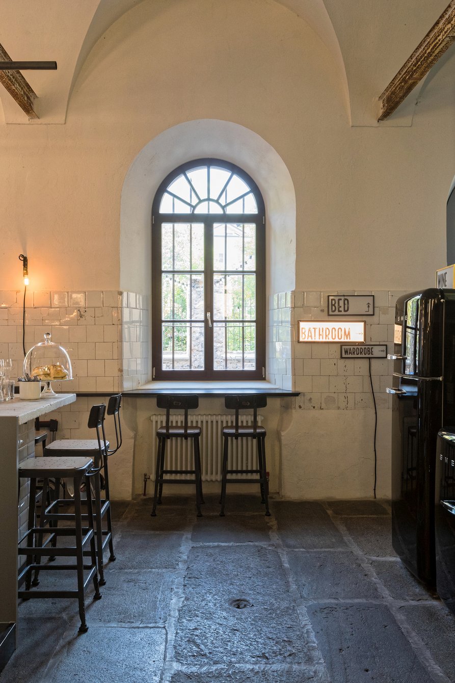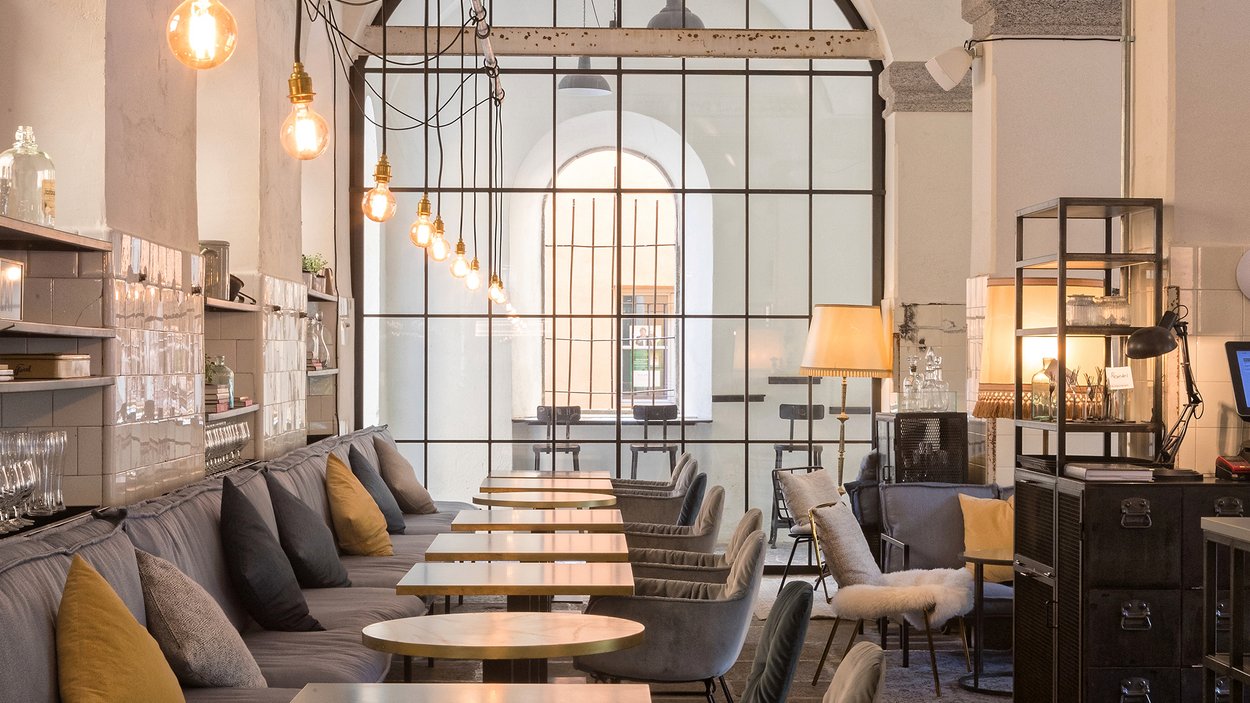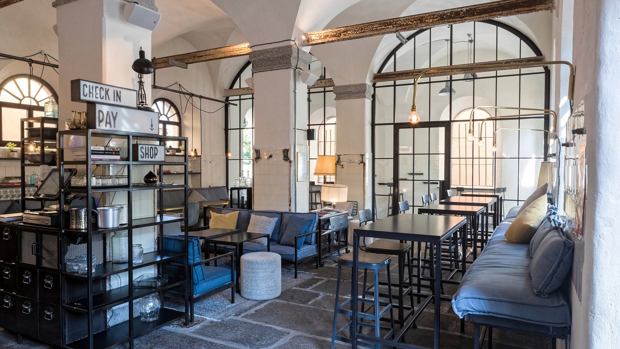 Das Gastronomiekonzept war ein Wohnzimmer für die Stadt zu schaffen und den dafür verschiedenen Ansprüchen gerecht zu werden. So gibt es Möglichkeiten zum Kaffeetrinken am Morgen alleine oder in der Gruppe, Mittagstische die flexibel zusammenstellbar sind, Sitzgruppen für einen Aperitivo und Tische für ein Abendessen. Erreicht wurde diese Flexibilität durch unterschiedliche Sitzmöglichkeiten und diverse Sitzhöhen. Hohe Tische mit Hockern auf der einen Seite, niedrige Esstische auf der anderen Seite getrennt durch Sitzgruppen mit Couches in der Mitte. Die Möbel sind aus Eisen gefertigt um dem Charakter des Raumes gerecht zu werden. Um trotzdem eine Gemütlichkeit zu erzeugen wurden diese mit weichen Polstern kombiniert die in einfarbigen Blautönen in Kombination mit Goldakzenten dem Raum die nötige Wertigkeit als Wohnzimmer geben. Die Küche wurde verglast um dem Gast ein anderen Bezug zur Essenszubereitung zu ermöglichen.